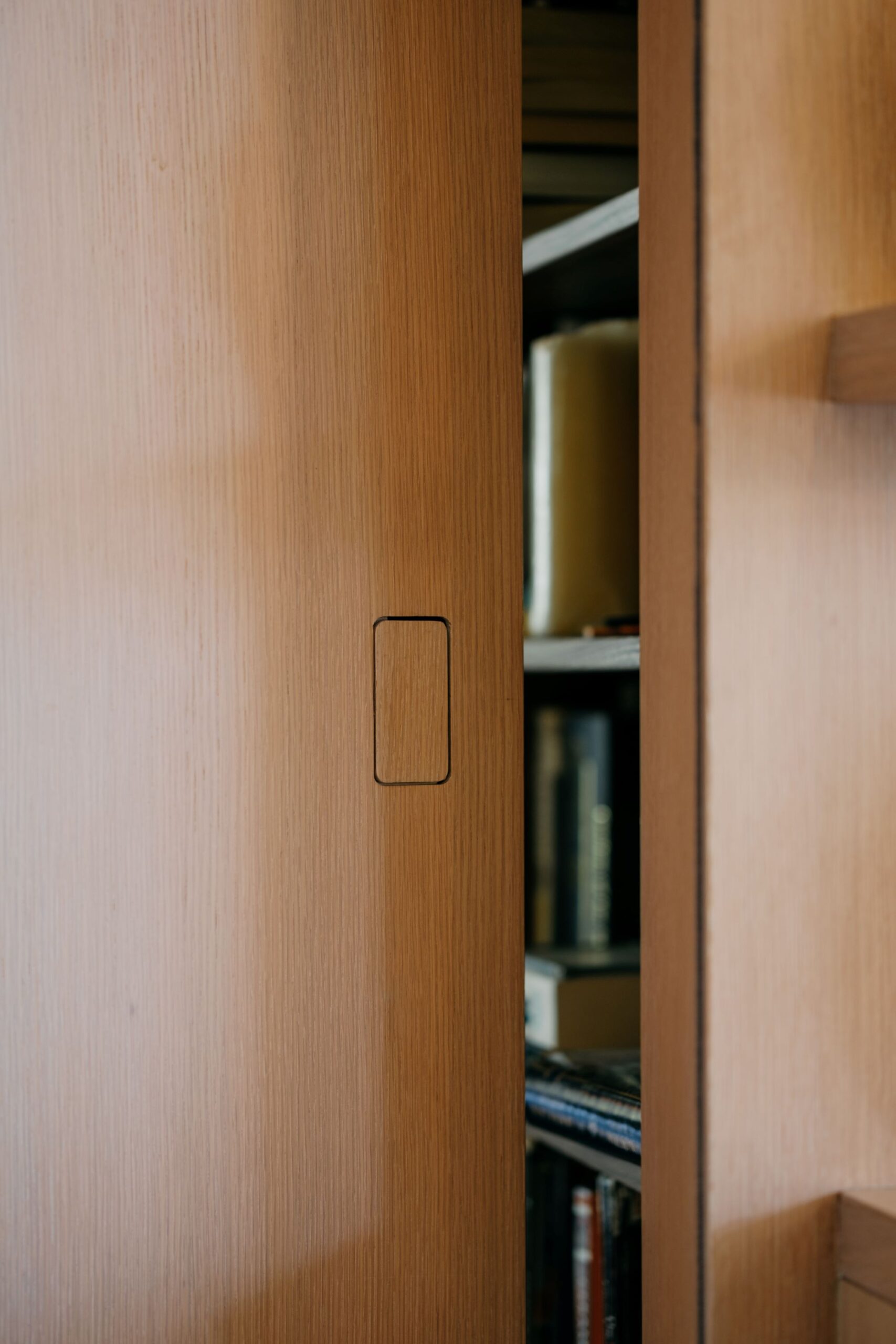 Modern Detailing: The project features flush doors without trim, flush baseboards with ¼”reveals, and hidden doors in the main feature wall of millwork. Seamless door hardware was used to blend these doors into the wall paneling, maintaining a clean, modern look.